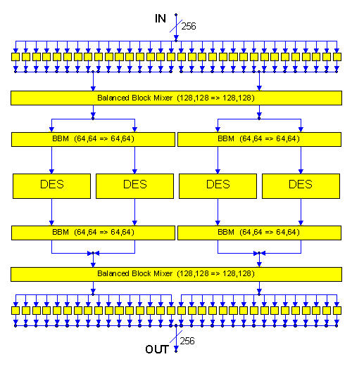 Each "---mix---" represents the mixing of the covered data blocks using Balanced Block Mixing technology. There are two levels of mixing on each side of the DES operations: The innermost levels each have two mixings which combine two 64-bit blocks; the outermost levels each have a single mixing which combines two 128-bit blocks.