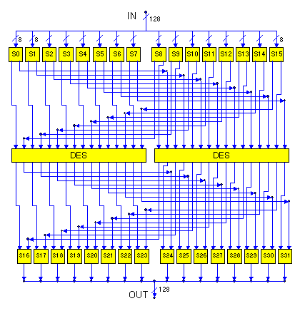 Here we show 2 of 16 input substitutions, and 2 of 16 output substitutions for a 128-bit block cipher. Each of the lines represents a single bit: Each input "S" contributes 4 bits to each of the two DES operations, and each output "S" takes 4 bits from each DES operation.