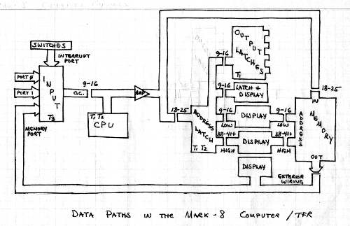 The essence of a computer, as opposed to the components which make it up, is the way the design moves data from part to part. Typically, data will flow on a data bus, here 8 metallic wires that carry the value being represented. The following is an attempt to show the buses involved and how they relate to the dispaly values as they appear on the Mark-8 front panel: