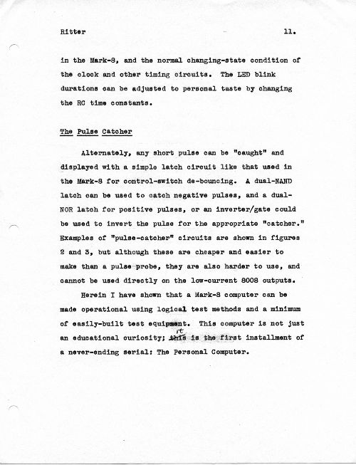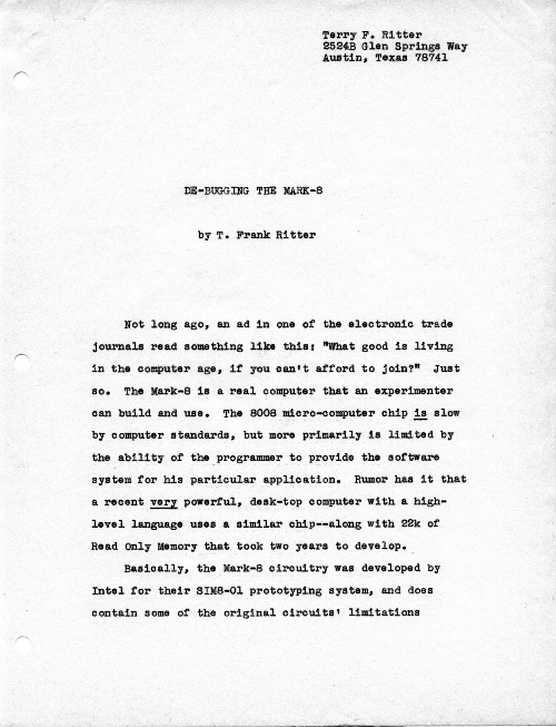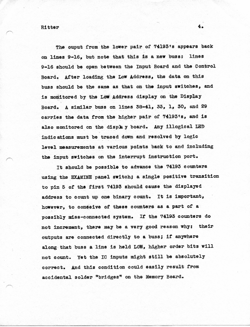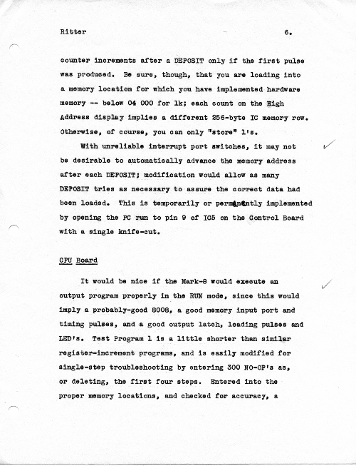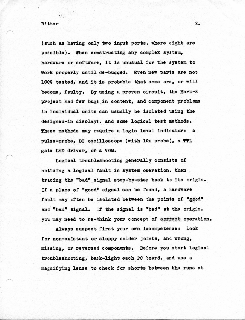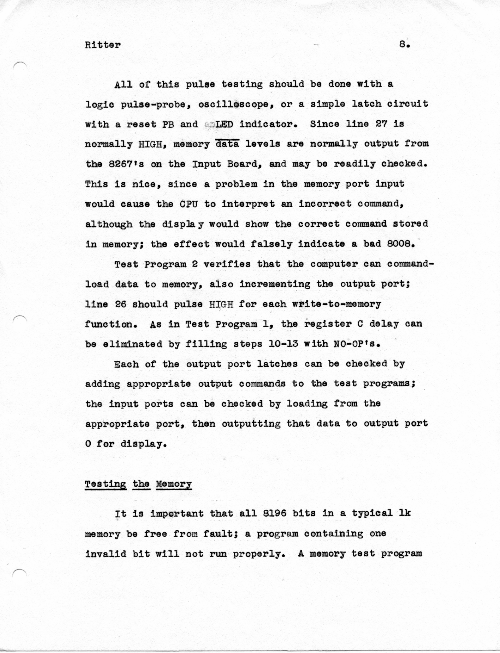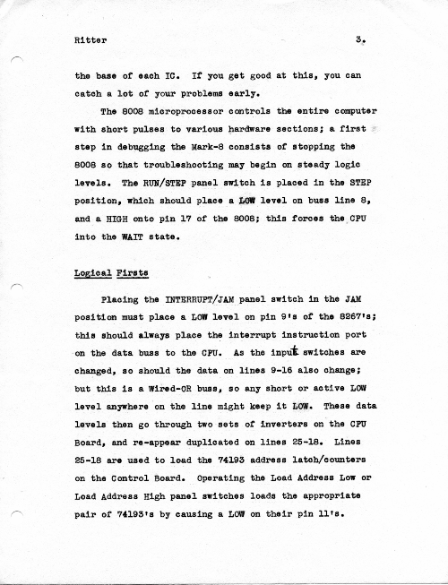 This is an article I wrote (and hand typed!) in October 1974 for publication, but which never got published. While I certainly hope I have improved my writing in the many years since, the article does give specific suggestions about how to bring up a new or buggy Mark-8.