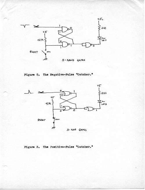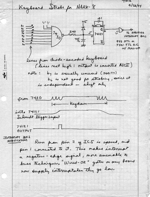 The first step toward civilizing the computer was to interface an ASCII keyboard to an input port. Although one might think that any reasonable keyboard would have a "strobe" line to indicate a keypress, my first one did not. So I designed a circuit to cause an interrupt whenever the keyboard produced a character. Then, if the computer was running a program which executed a HALT instruction, and if the interrupt switches were set to NOP, a keyboard interrupt would just cause the program to continue. Typically, the next few instructions would pick up the key value before it changed.