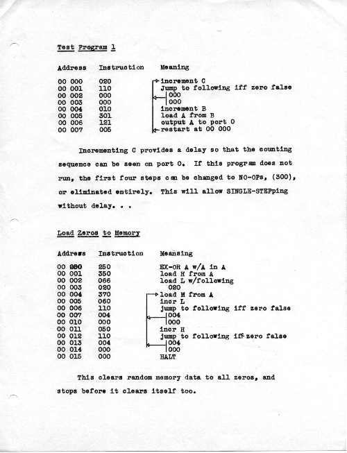 All of this was before PC's, so one could not simply use a PC to edit a source code program and then compile it. I never had an editor, or a compiler, or an assembler for the 8008. All my programming was done in raw machine code. That was much easier than it sounds.