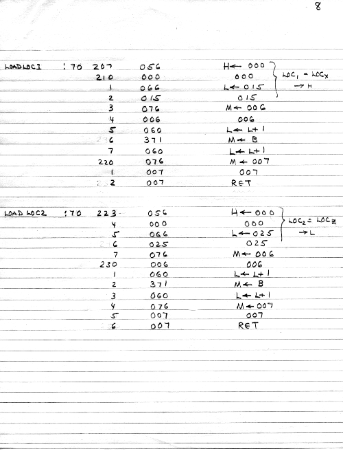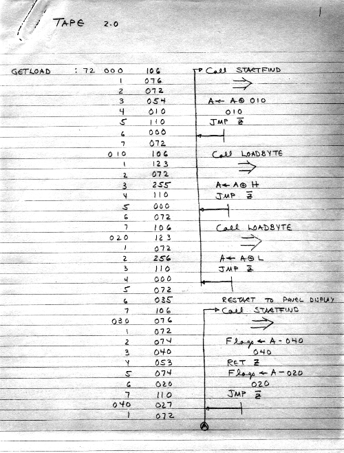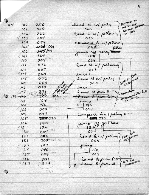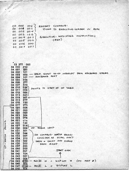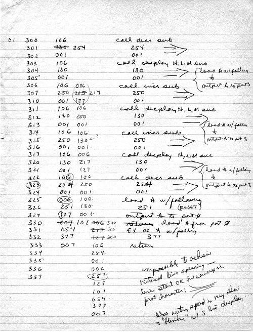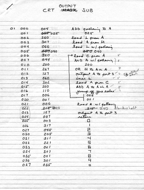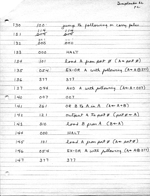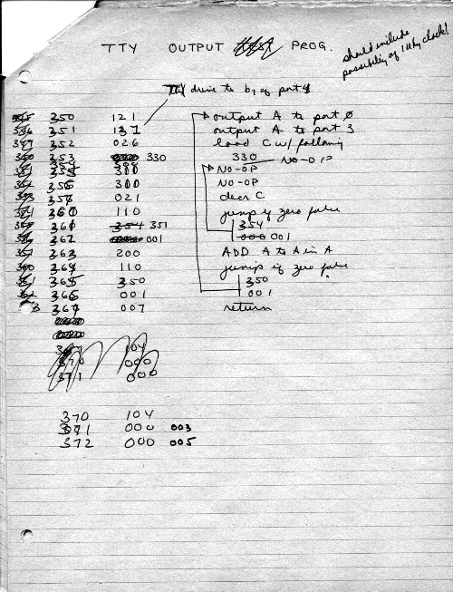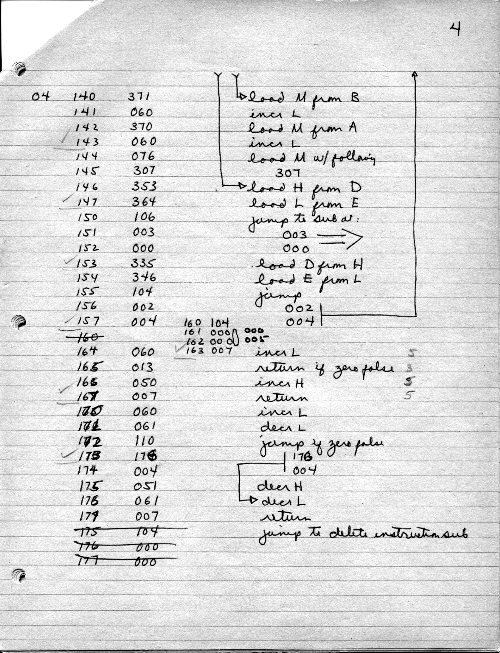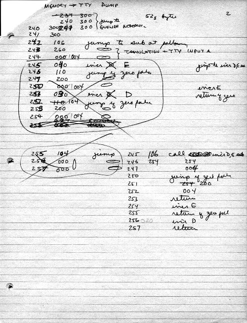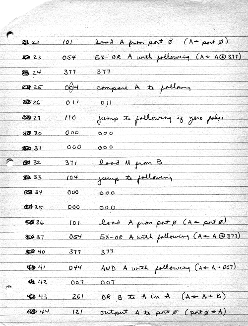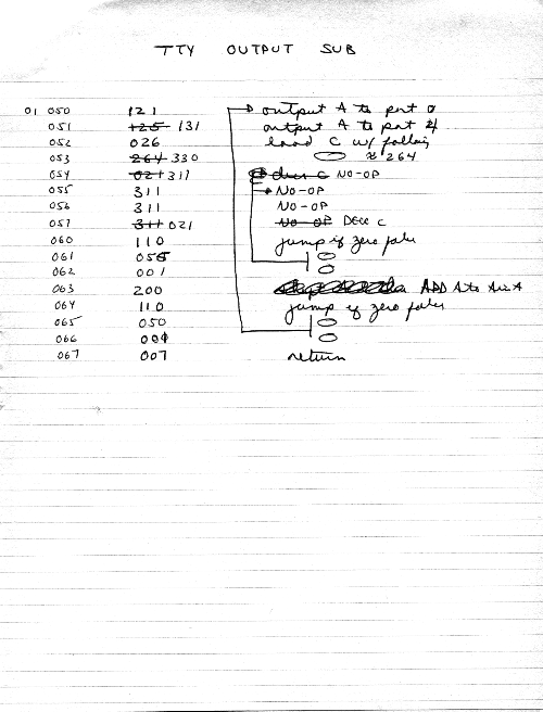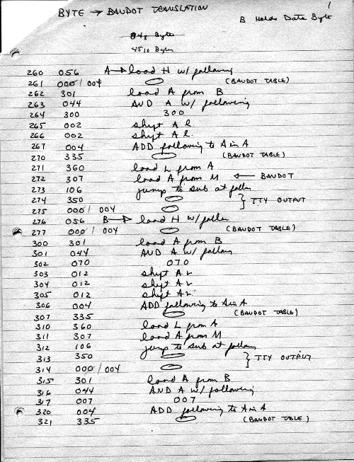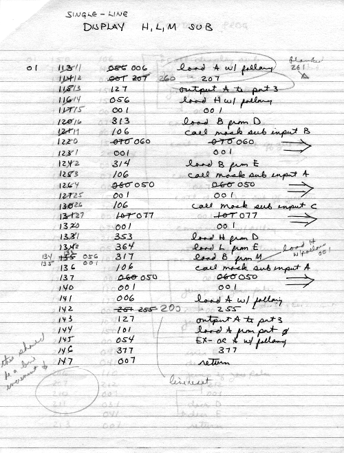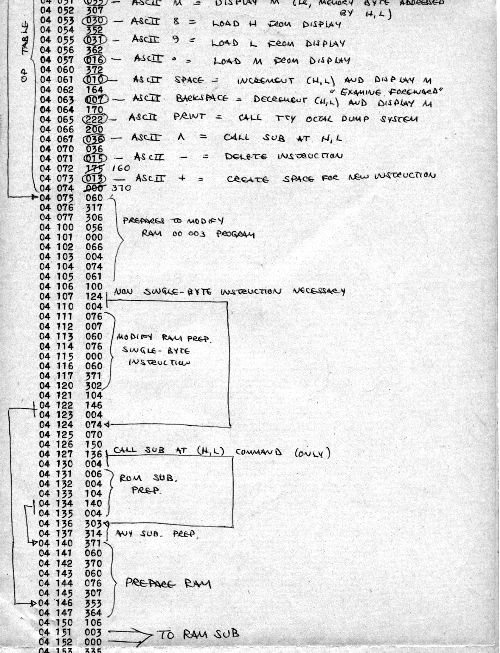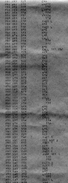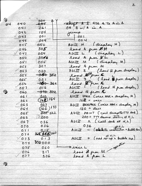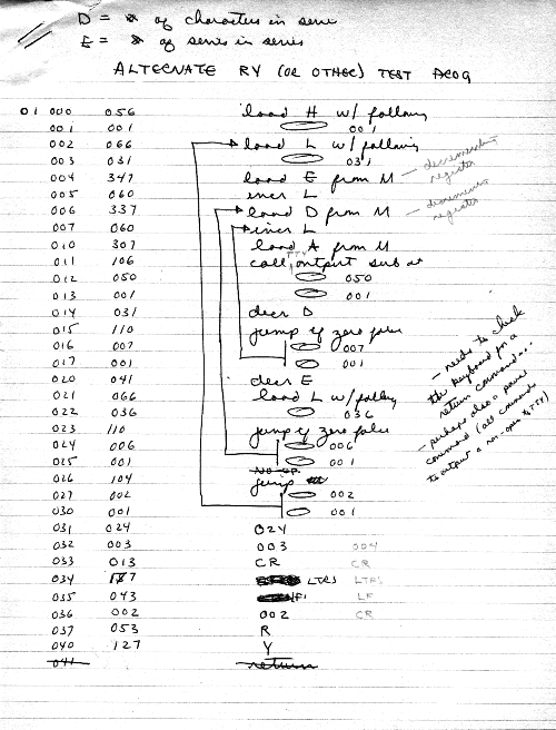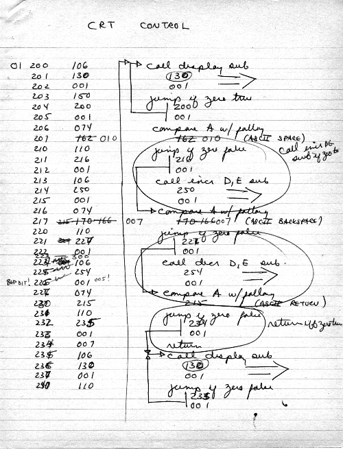 I would of course work out an entire 8008 program in pencil on paper, location-by-location, before typing it in. Then I would have to modify the program on that listing because there was no editor where I could fix up the source and type out a clean listing.