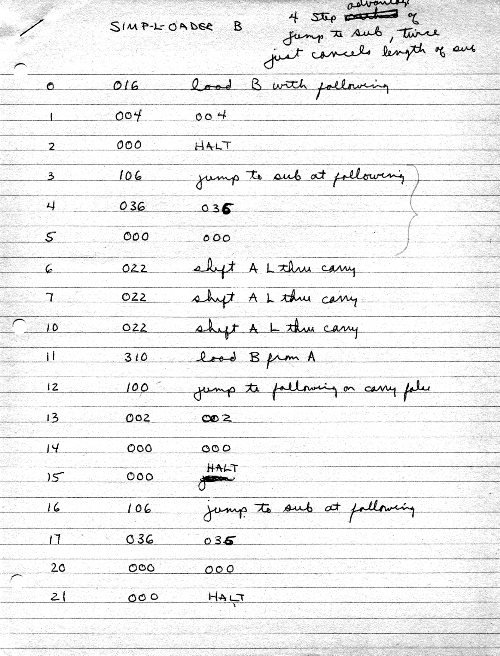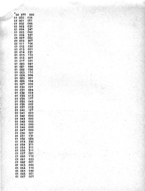 Then I wrote a simple "loader" program whose only purpose was to take numeric values in octal from the keyboard, collect them into bytes (3 octal characters per byte) and store them in memory. As a result, I still had to enter the loader program from the bit-switches, but the loader was very short, and after that was running I could just type-in a program as octal, and that was much easier.