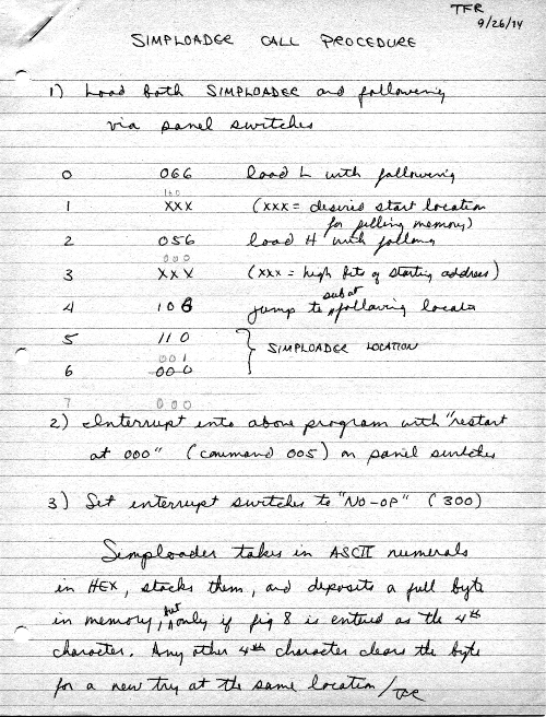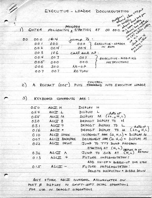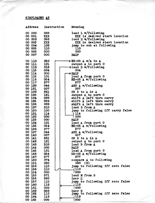 This is just about the simplest sort of keyboard loader that one could get, and may be one of the earliest 8008 programs that I wrote (9/26/74). (Naturally there had to have been a few programs earlier, since I would not have seen the motive for having a keyboard loader until I had put in some fairly long programs by switches a few times. Loader E would have been the 5th major loader version.) The keyboard loader provided a way to type a program into memory instead of having to use the front-panel switches to set the value of every byte of a program. The loader was intended to have a minimum of jumps, because jump addresses had to be changed if the program was moved to a new location.