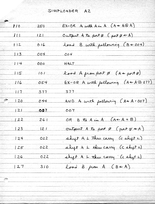 Normally, the computer (under control the loader program) would sit in HALT and wait for a key. When a key was pressed, the keyboard put out a character and my interface hardware caused an interrupt to the computer. Because the setting of the interrupt switches was NO-OP, the interrupt simply ended the HALT condition, so the purpose of the interrupt was timing only. Quickly the computer executed an INPUT instruction (Load A from Port 0) thus picking up the key value. The computer then masked out the lower 3 bits of that value, and shifted them left into an accumulating value. The result was then sent to port 0, the front panel bottom LED row, so that the operator could see the value accumulate. After the first three keypresses, the program would just HALT the computer to await another interrupt. But on the fourth keypress, if the value was ASCII '8', the accumulated value was stored, the memory pointer moved, and the accumulated value cleared to start over with another byte. This is not particularly intuitive, but it was the very first such program I had ever seen.
