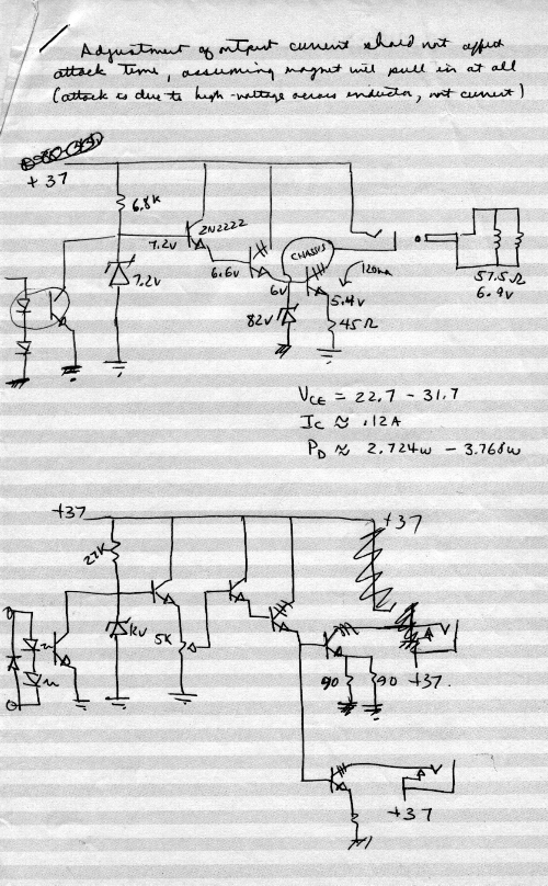 An early driver schematic. This is basically a constant-current source, driven by an optoisolator. The second input diode is a front-panel LED to indicate signal. The relatively high voltage assures a fast attack. I believe the zener eventually migrated to across the output, with a series diode: the inductive "kick" has a reverse polarity; by allowing that to rise to a reasonable voltage before dissipating in the zener, we get a fast decay.