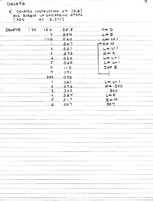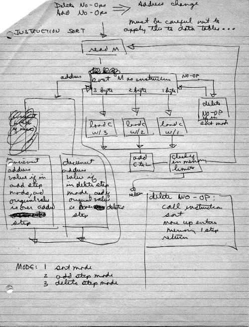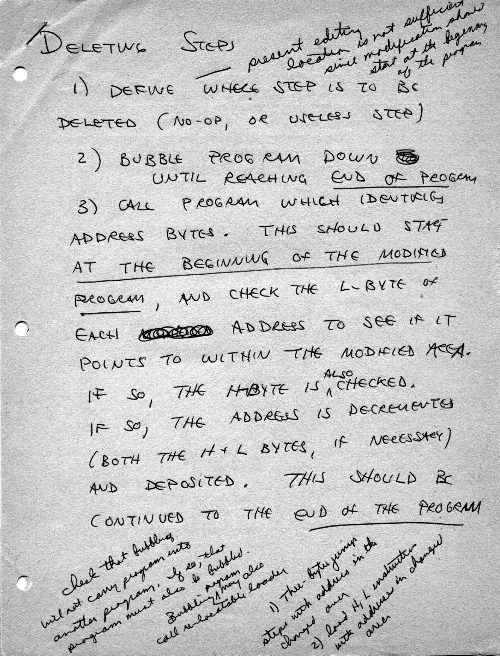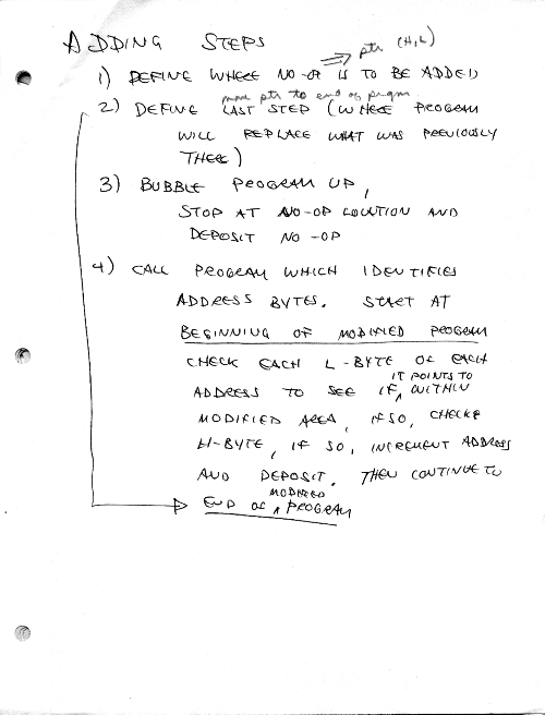 One approach is to allow direct machine-level editing of executable code. That means we may want to delete instructions, in which case the rest of the code should move down (toward low memory) accordingly; or we may want to add opcodes, which should move the rest of the code up. At the end, I developed routines which would insert or delete a location from within a program, and then fix up only the affected JUMPs and CALLs.