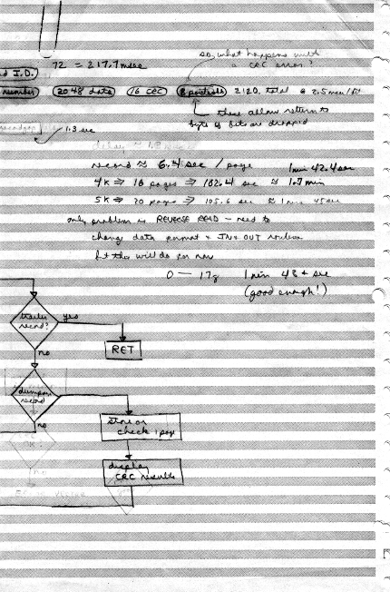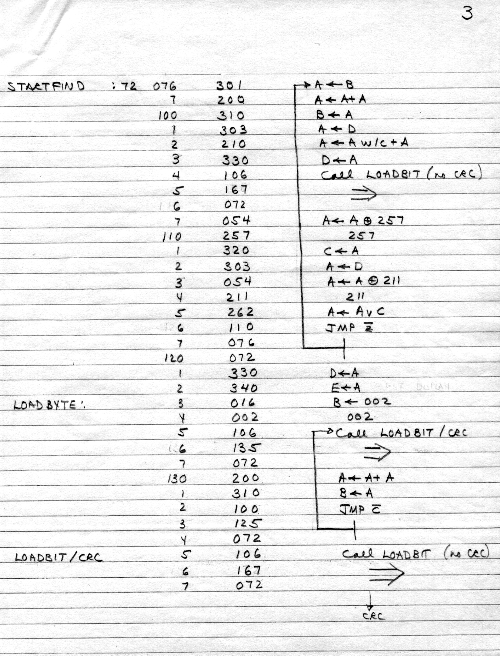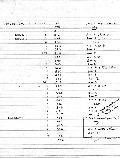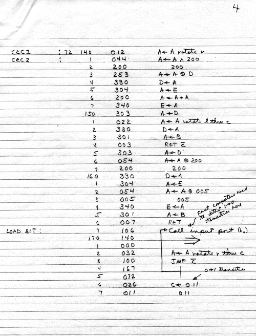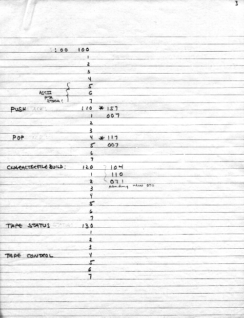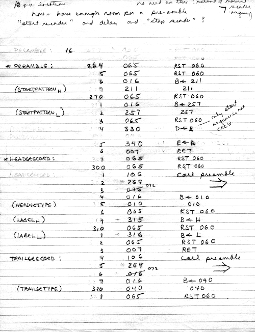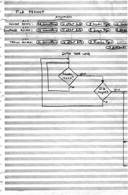 This was all in one paper-clipped set. Here we have tape structure, including "named" (actually, numbered) files and per-record error-checking CRC's. It looks like Carl is showing an implementation of the tape system in his personal assembler in January 1975.