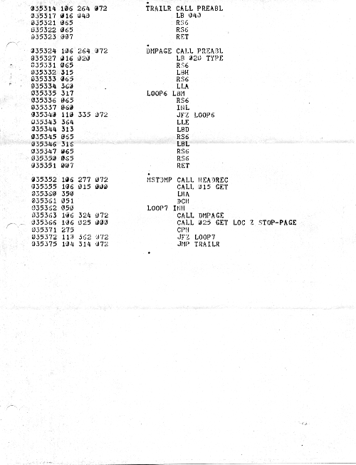 Here we have the "documentation listing" for the same system. This is on the old, brown canary teletype paper. (This paper also browned the first two sheets of the above handwritten version.)