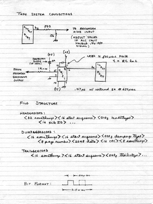 I cannot remember who came up with what. But I think Carl came up with the idea of sending pulses to the tape recorder, instead of tones. So a short period between pulses might be a '0', and a longer period might be a '1'. My guess is that Carl had had a hardware solution, and that I promoted having software do the timing, and wrote that software. The tape audio output would go almost directly into a Schmitt trigger device (at first a 74121 Single Shot, then a 7413). Then the computer would measure the period between pulses and assign a data value. Surprisingly, it worked.