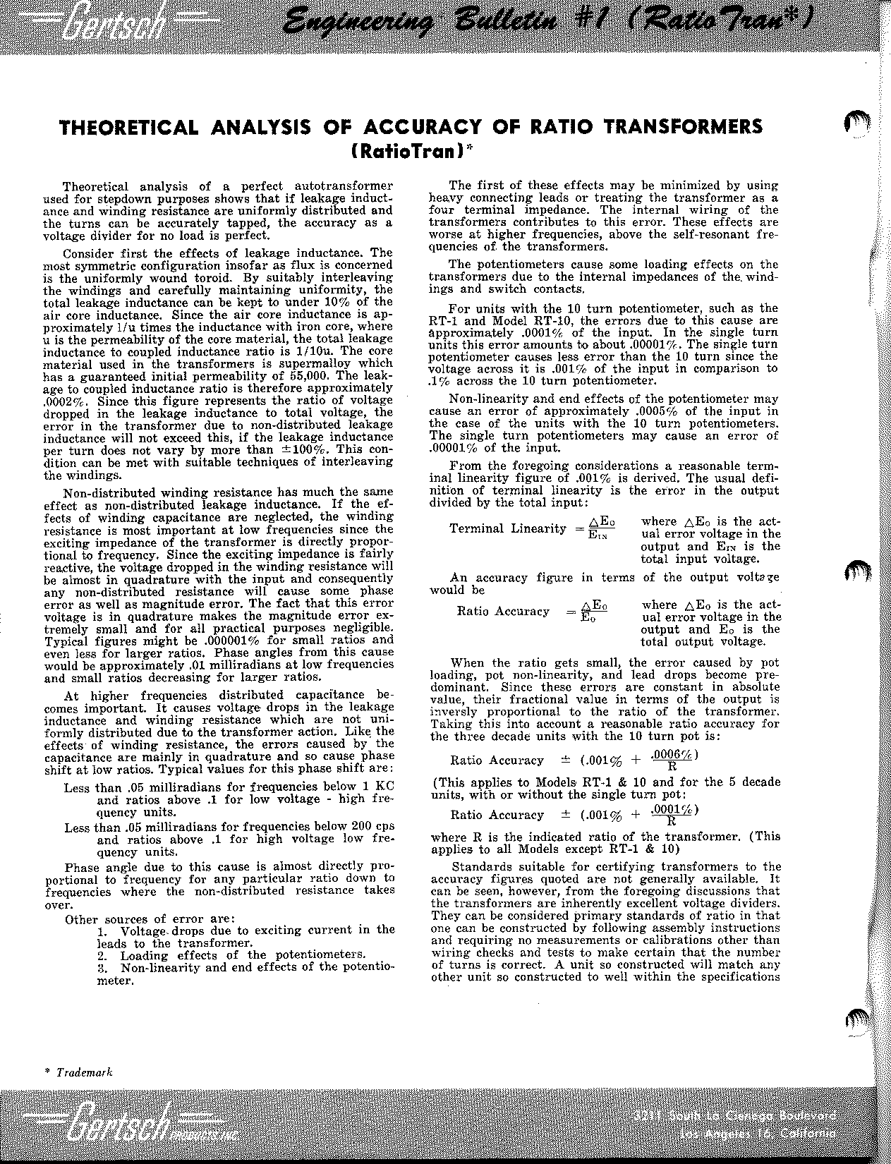 An obvious parallel would be a 10-turn precision potentiometer, which "divides" the voltage present at the outside terminals. These typically have a linearity of 0.25 percent, although some are rated as tightly as 0.05 percent. But a Gertsch AC Ratio Standard has a rated terminal linearity of 0.0001 percent.