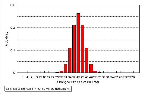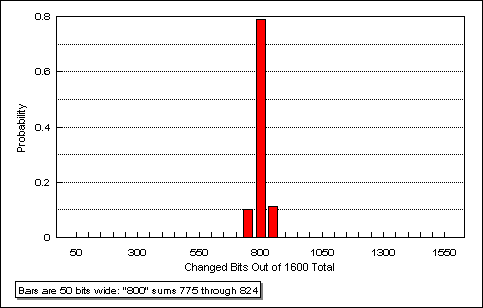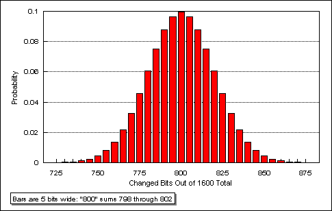 In a 1600-bit block, the vast majority of bit-changes are confined to only 10% of the possible range. In fact, 99.98% of the time, the observed bit-changes should fall in the range of 725..874. This is just the three middle bars of a 31-bar display.