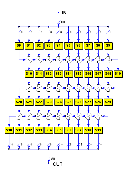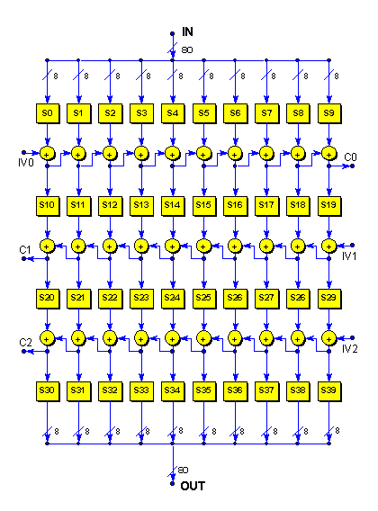 The 80-bit input block is split into ten 8-bit columns and processed by a confusion layer. All of these results are mixed by an exclusive-OR chain in a right-going diffusion layer. Subsequent diffusion layers are left-going. Each diffusion layer implies both an Initial Value from outside the cipher and a Carry value which can be used for expansion. In practice, yet another pair of layers might be needed for best strength.