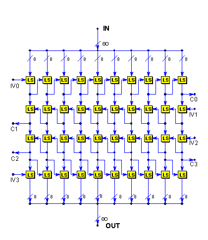 Because the structure of the mixing component differs from the exclusive-OR used in examples 1 and 2, the diffusion architecture of example 3 is accordingly different. In particular, there is always one less Balanced Block Mixing in the diffusion layers than there are element-wide data paths and substitution elements in the confusion layers. We can think of the Balanced Block Mixing as fitting in the space between adjacent confusion columns.